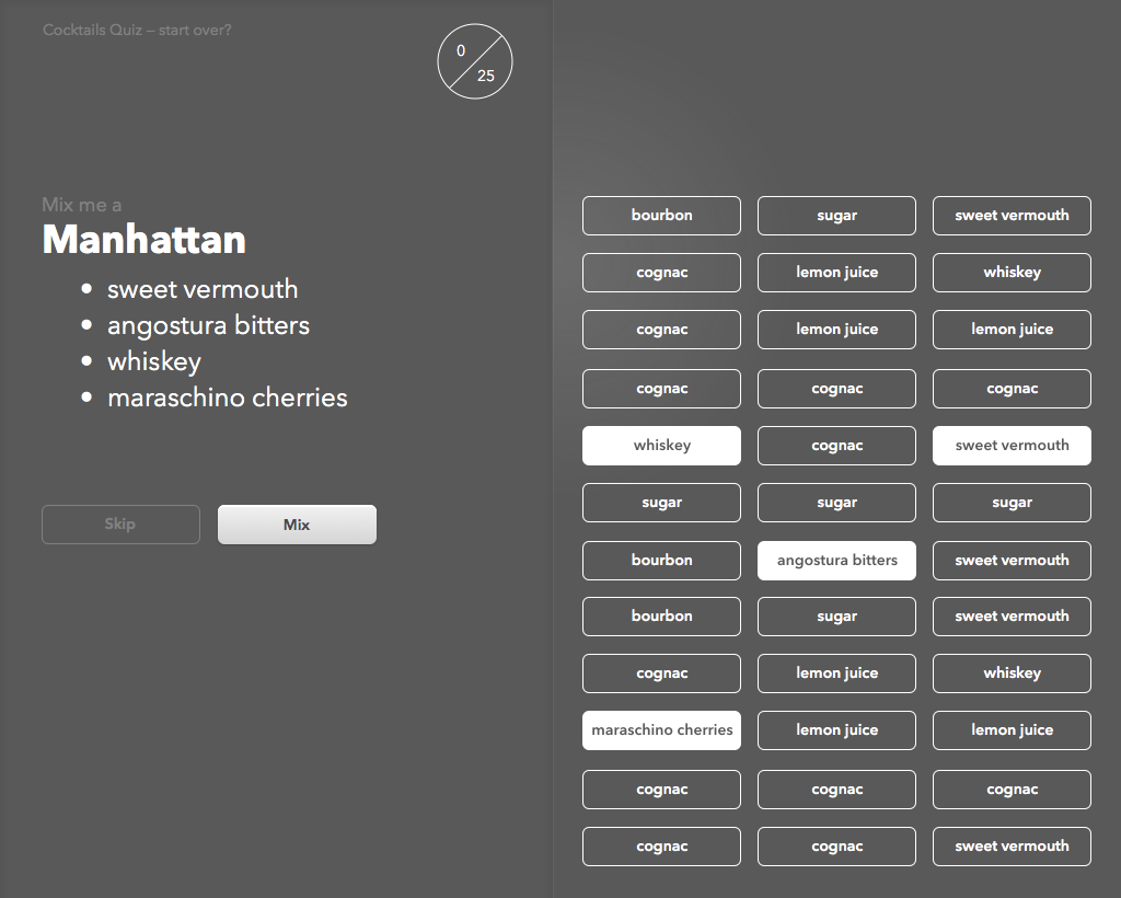 The goal for this project was to create a quiz app for learning how to mix the "25 essential cocktails". In online courses the immediate feedback that can be provided for quizzes is known to lead to improved learning outcomes over static or print homework. For this reason I also wanted to provide feedback to the user on the ingredients selected, and wrote responses for possible cases, e.g. from "too few ingredients and none are the right ones" to "the right number of ingredients and all the right ones" to "no ingredients selected".