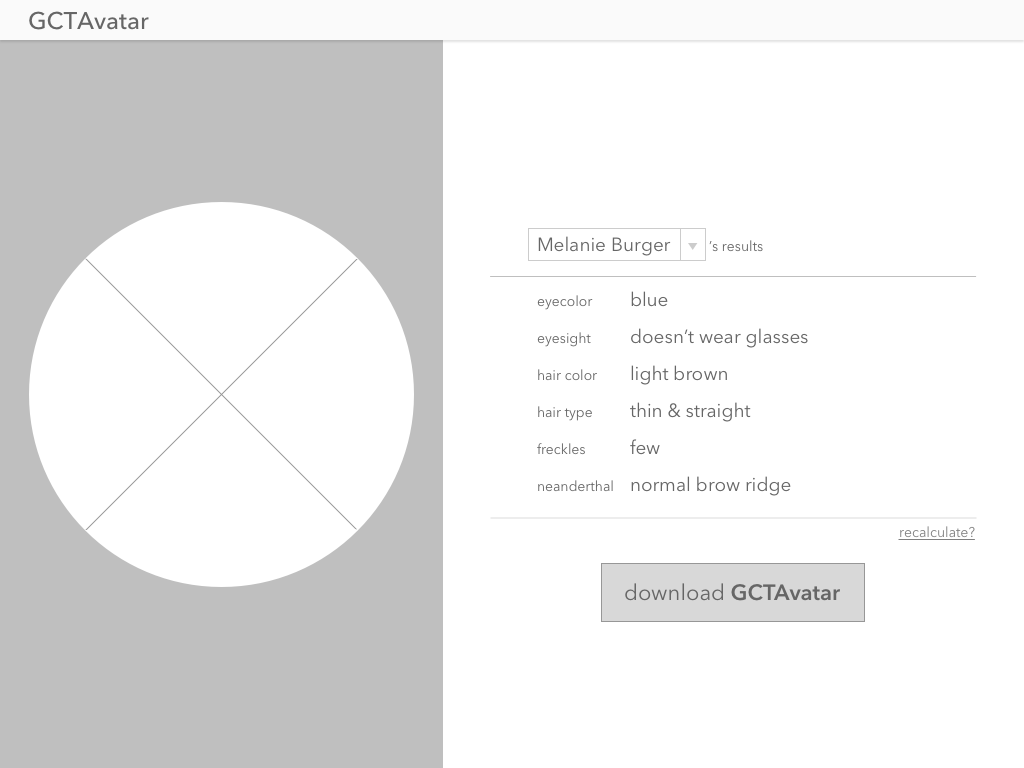 Could genetic data from the 23andMe API, be used to set up the base stats of a virtual avatar? Then, what if biometric data from the fitbit API could be synced with your avatar so that you could level-up alongside your avatar? Mix in a 3D scan of your body, and you have a virtual doppelgänger ...and potentially a dystopian universe. Nevertheless, this project explored how the 23andMe API could be used to initialize a custom avatar image based on genetic data.