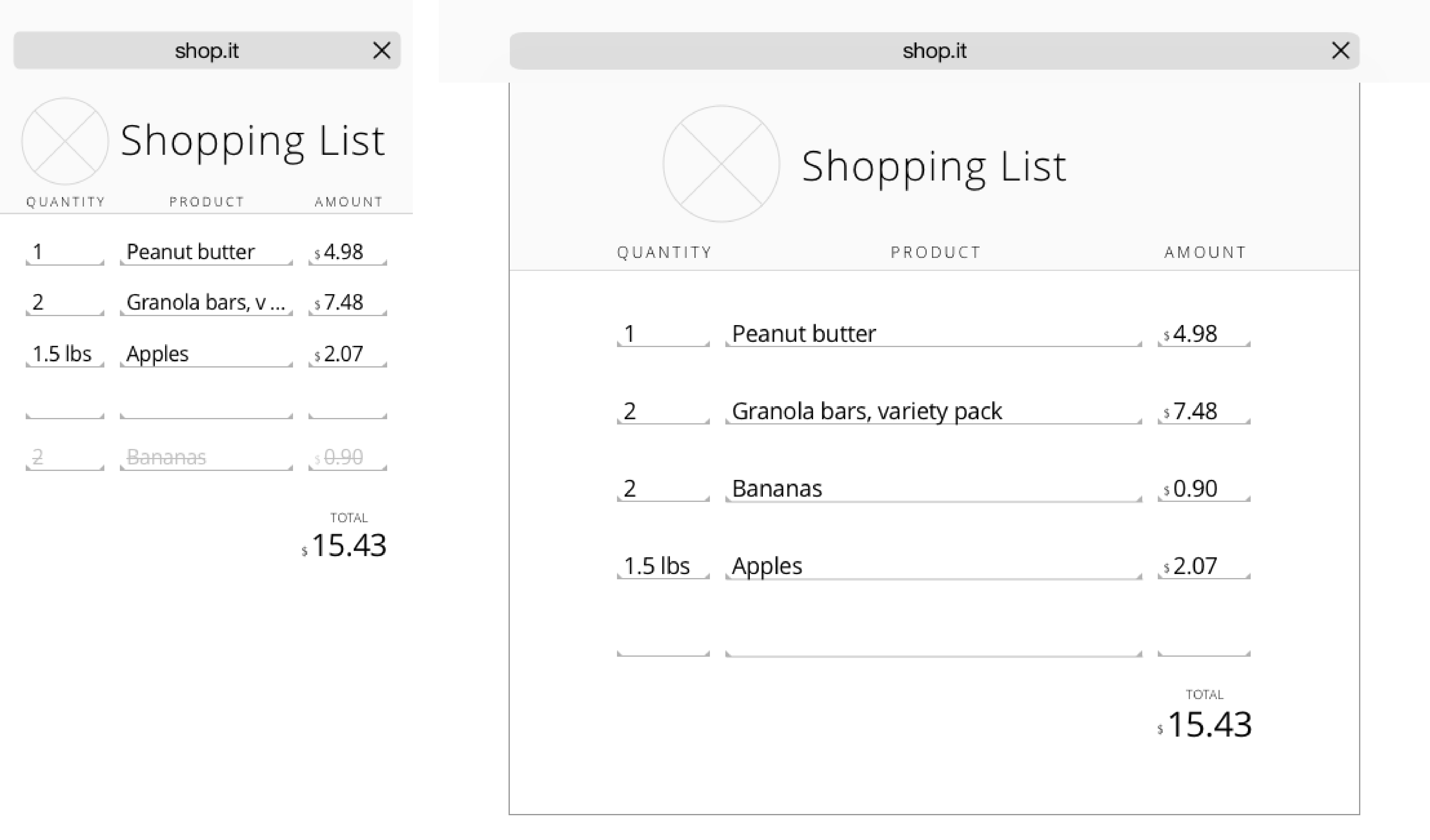 1Some grocery items are priced by weight, not by quantity and I wanted to allow for this. I created a JSON file that listed grocery items along with a price-per-unit and price-per-kilo where applicable. I used regular expressions to extract numbers from the input quantity and look for "kg", which if present, would then use the price-per-kilo multiplier for the item (Snippet 1). A few problems with this is that the quantity input is too permissive: if the user enters "12.3kj" the form won't complain but simply use 12.3 as price multiplier – form validation needs to be added.